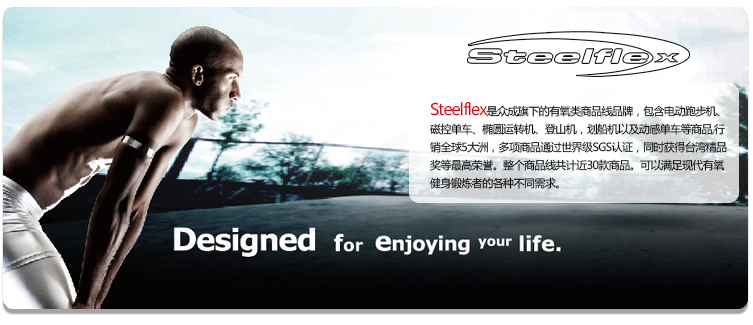 Steelflex是眾成旗下的有氧類商品線品牌,包含電動跑步機、磁控單車、橢圓運轉(zhuǎn)機、登山機,劃船機以及動感單車等商品,行銷全球5大洲,多項商品通過世界級SGS認證,同時獲得臺灣精品獎等榮譽。整個商品線共計近30款商品?梢詽M足現(xiàn)代有氧健身鍛煉者的各種不同需求。其中FITNEX 銀陣系列又將時尚設(shè)計與專業(yè)品質(zhì)得以完美的結(jié)合。